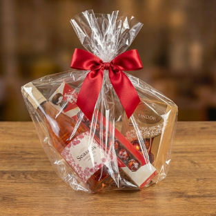 At the heart of this gift is a bottle of wine, paired with smooth Lindt chocolates and nostalgic Sweetie Pies. It is beautifully arranged in clear cellophane and tied off with a striking red ribbon for that romantic finish.